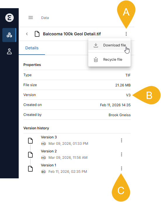 To download a file from a workspace, choose Download file from the file’s overflow menu (A). This downloads the latest version of the file, which is the version indicated in the details list (B):