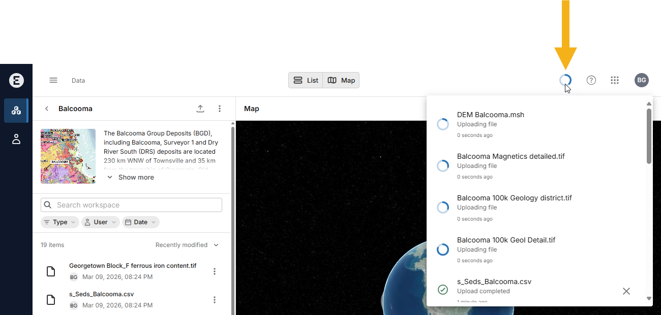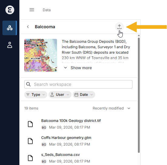 To start uploading one or more files, open the workspace and click the upload button (