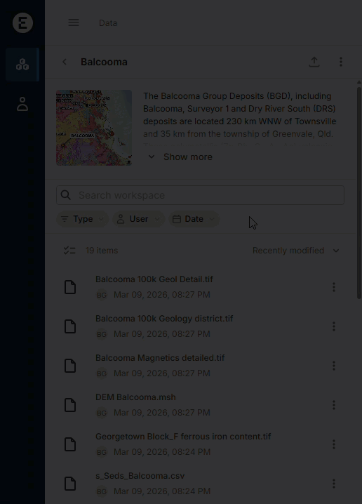 Files are unstructured geoscience data from any source. Files can be added to a workspace via the File API. In addition, you can directly upload files to an Evo workspace in the Evo portal.