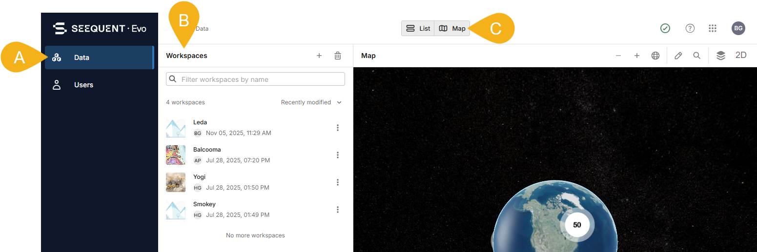 Click on Data in the sidebar (A) to see all the workspaces you have permissions for (B). If the map is also displayed, you can hide it by clicking the Map button (C) at the top of the window: