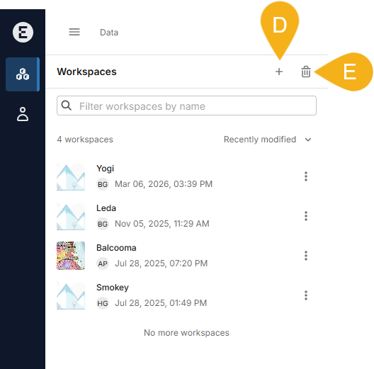 There are two buttons at the top of the workspaces list. These are for creating a new workspace (D) and opening the workspaces recycle bin (E):