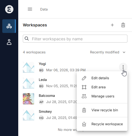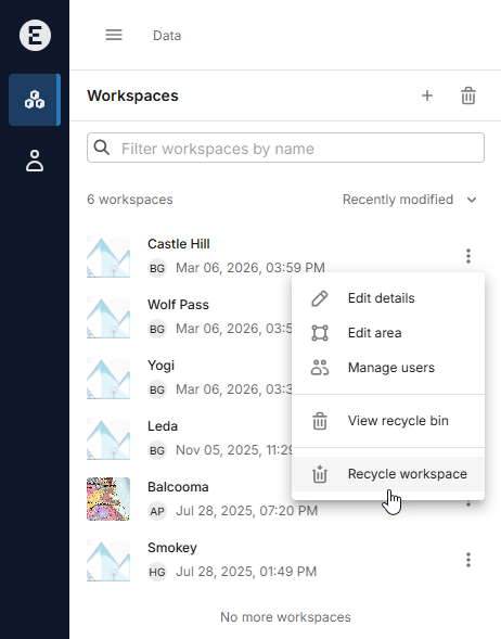 If you are the owner of a workspace and wish to remove it, click on Data in the sidebar, then choose Recycle workspace from the workspace’s overflow menu: