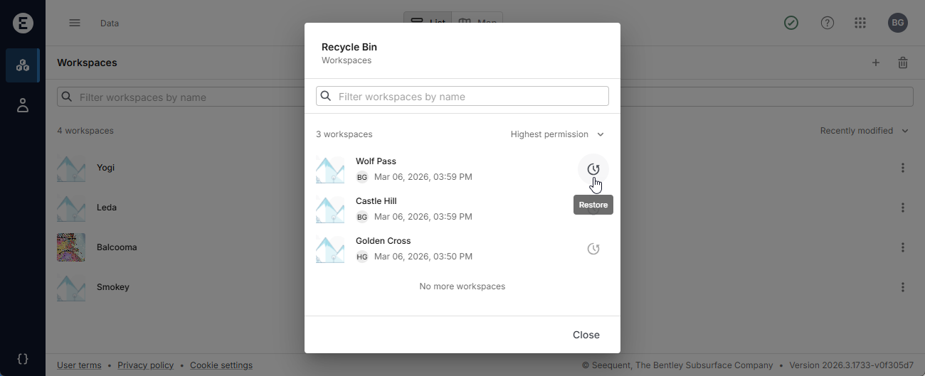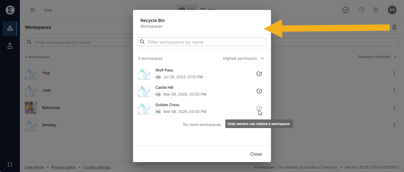 You must be an owner of a workspace to recycle or restore it, but all recycled workspaces you have permissions for are shown in the workspace recycle bin, even if you are not able to restore them. In the example above, the signed in user is the owner of both the Wolf Pass and the Castle Hill workspaces and so is able to restore them. However, the user cannot restore the Golden Cross workspace because they are not an owner.
