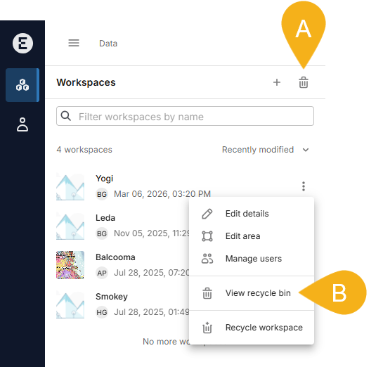 If you are an owner of a recycled workspace, you can restore it from the recycle bin. To do this, click on Data in the sidebar, then click the recycle bin button (