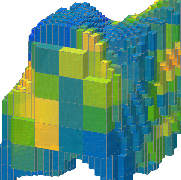 This same model has been sub-blocked with a sub-block count of 4 x 4 with Variable height ticked and a Minimum height of 0.0. The sub-blocks are regularly sized and placed in the X-Y plane, but the Z height of the sub-blocks are not regular in size or placement. The height of a block is not divided into multiple sub-blocks, but the single block can be any height between 0 and the block height. The variable height block is measured inward from the top or the bottom edge of the block, making variable height blocks grow up and down from the block boundary, but sub-blocks will not hover between the top and bottom edges of parent blocks.