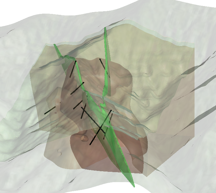To plan a multiple deviation drillhole, first add items to the scene that will assist you in locating a suitable path for the drillhole. You may want to add topography, a geological model, faulting and existing drillholes to the scene.