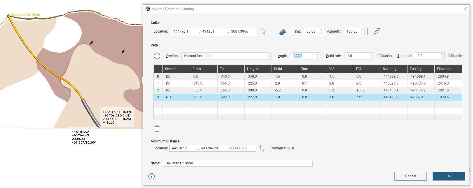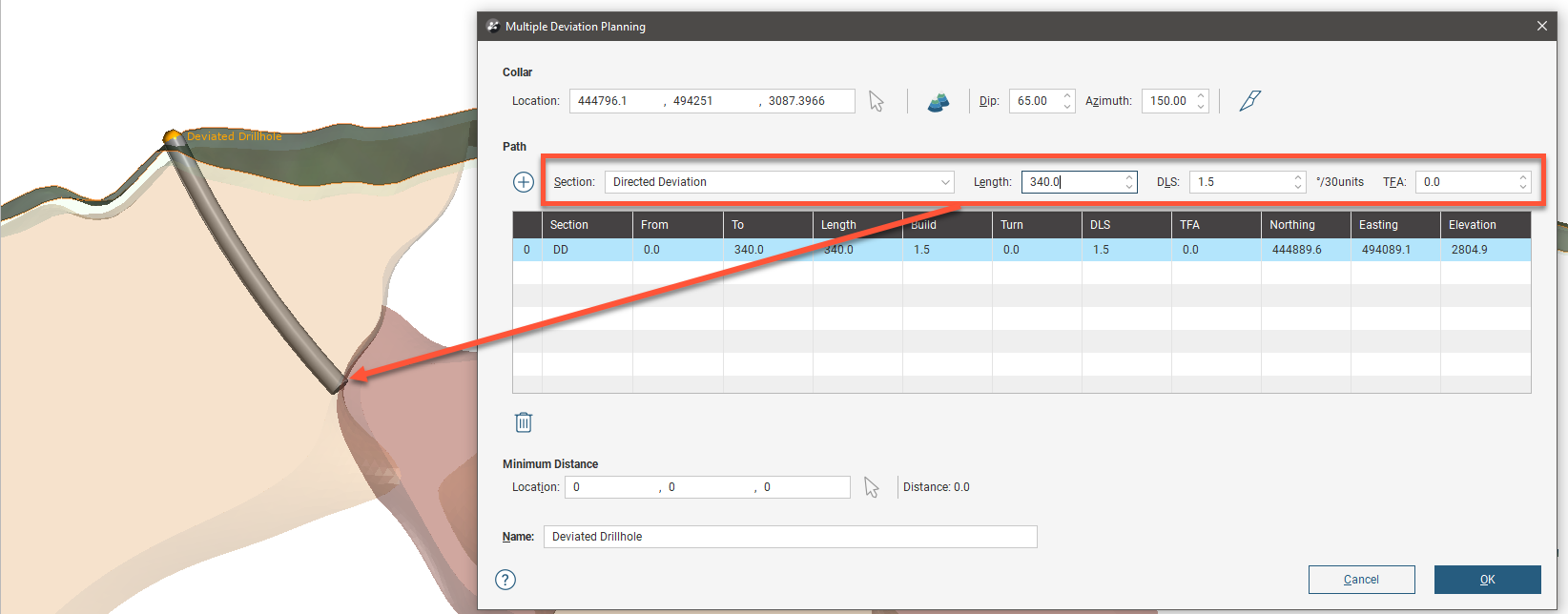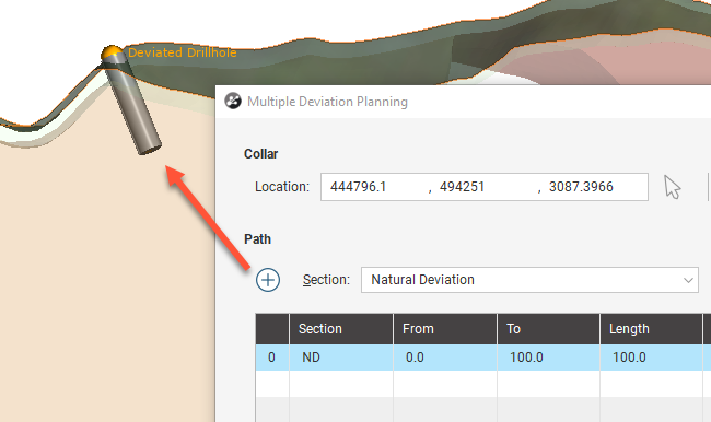 ) to extend the planned drillhole with an additional section. It is possible to mix Directed Deviation and Natural Deviation sections.