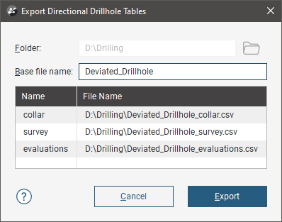 A planned multiple deviation drillhole can be exported as interval tables in *.csv format. To do this, right-click on the drillhole and select Export as Interval Tables. In the Export Directional Drillhole Tables window, the files that will be created are listed, one each for the collar and survey table and one for the evaluations: