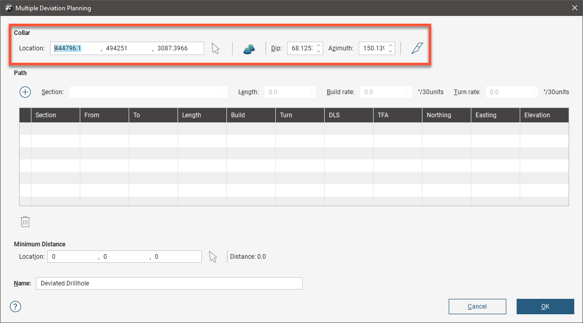 You will not see any object added to the scene yet, but the Collar location fields will have been updated. The Dip and Azimuth for the initial drilling direction can be adjusted.