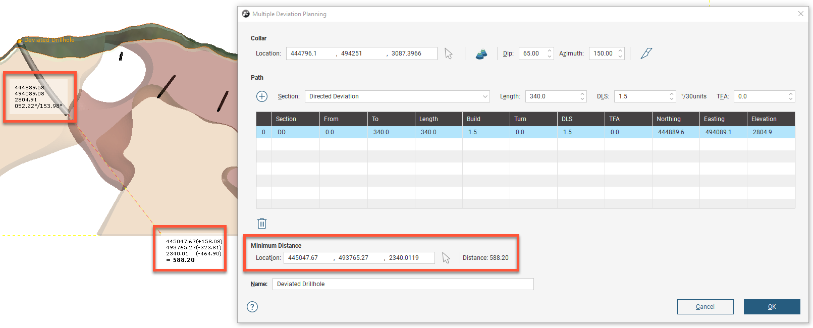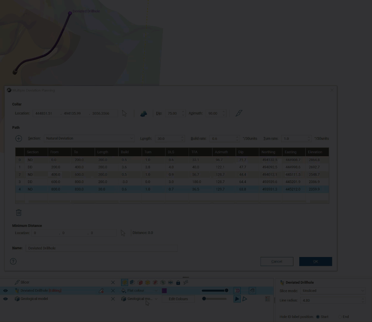 Changes you make in the Multiple Deviation Planning window are updated in the scene, so position the window in a way that allows you to see the scene. Note also that the drillhole has some special colouring options to indicate the Section type (natural or directed deviation) or the Dog Leg Severity.