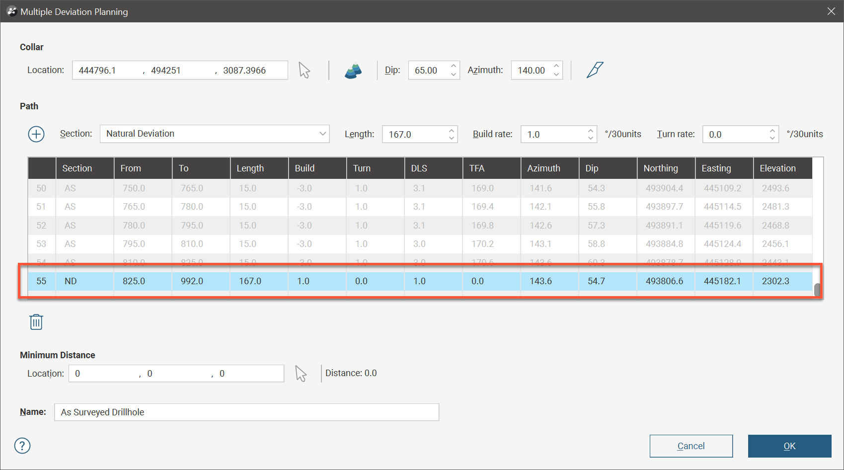 Once you click Finish the Multiple Deviation Planning window will be opened so the remainder of the drillhole can be planned. If the as-surveyed drillhole is shallower than the originally planned drillhole, an additional planned interval extending past the last interval out to the originally planned depth will have been added to the path table. This interval can be deleted or modified as necessary.