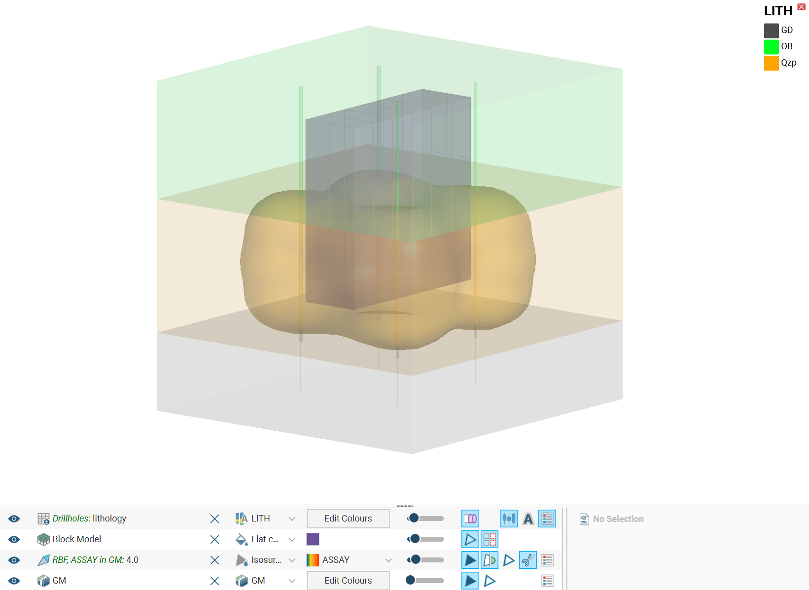 The effect of proportions-of-proportions undervaluing estimates is further illustrated using this simplified example. The geological model comprises three layers, with the middle layer being a rich ore-bearing layer topped with an overburden of waste rock. An isosurface shell has been created using the limited drilling data identifying a region of rich ore, and a simple block model has been created between the drillholes.