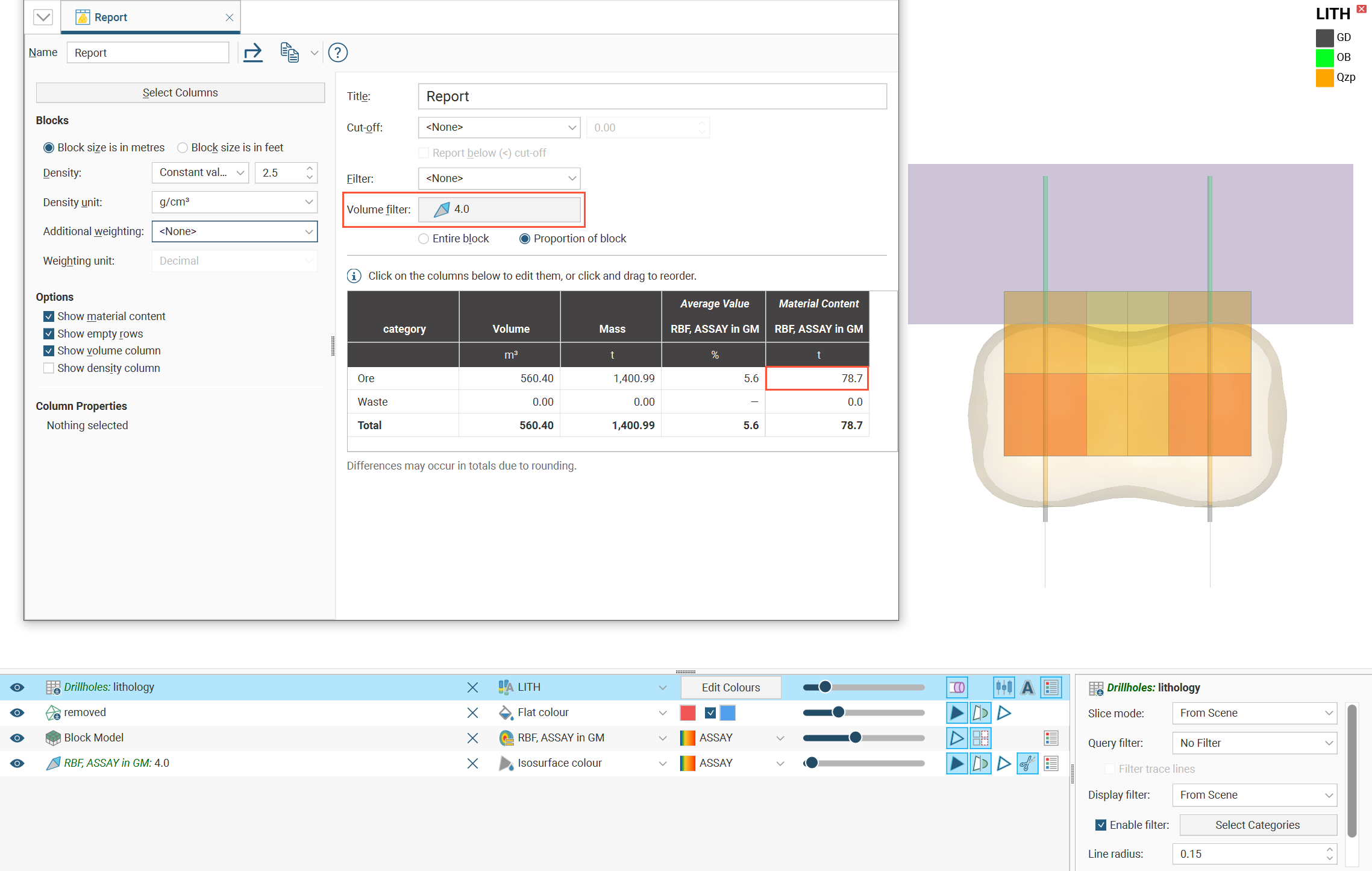 - If Proportion of block is selected, only the proportion of a block that is within the selected volume will contribute to the report.
