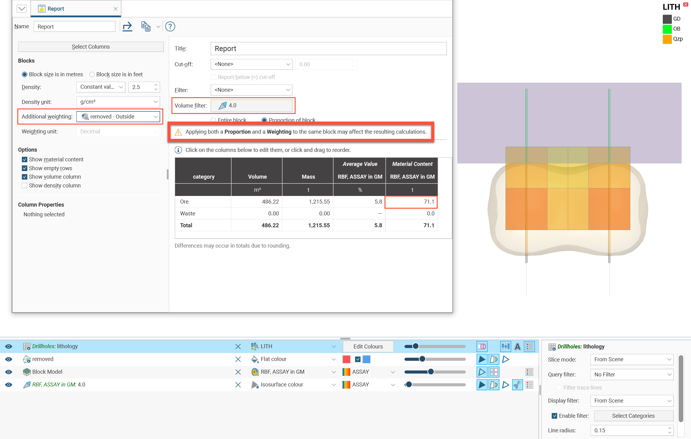 Another mesh called “removed” models the removed overburden that was all waste rock with no ore. It has been used to create a stored proportion column for the block model, indicating the percentage of each block outside the “removed” region. If this proportion is used as an additional weighting for the resource report along with a volume filter, two independent volume-weighted proportions are being applied, resulting in an inaccurate result. We would intuitively expect that because the removed rock is all waste overburden, that the reported material content should not be substantially different, but because each block has been scaled by the value calculated in the proportion column, the material content is now reported as 71.1t.