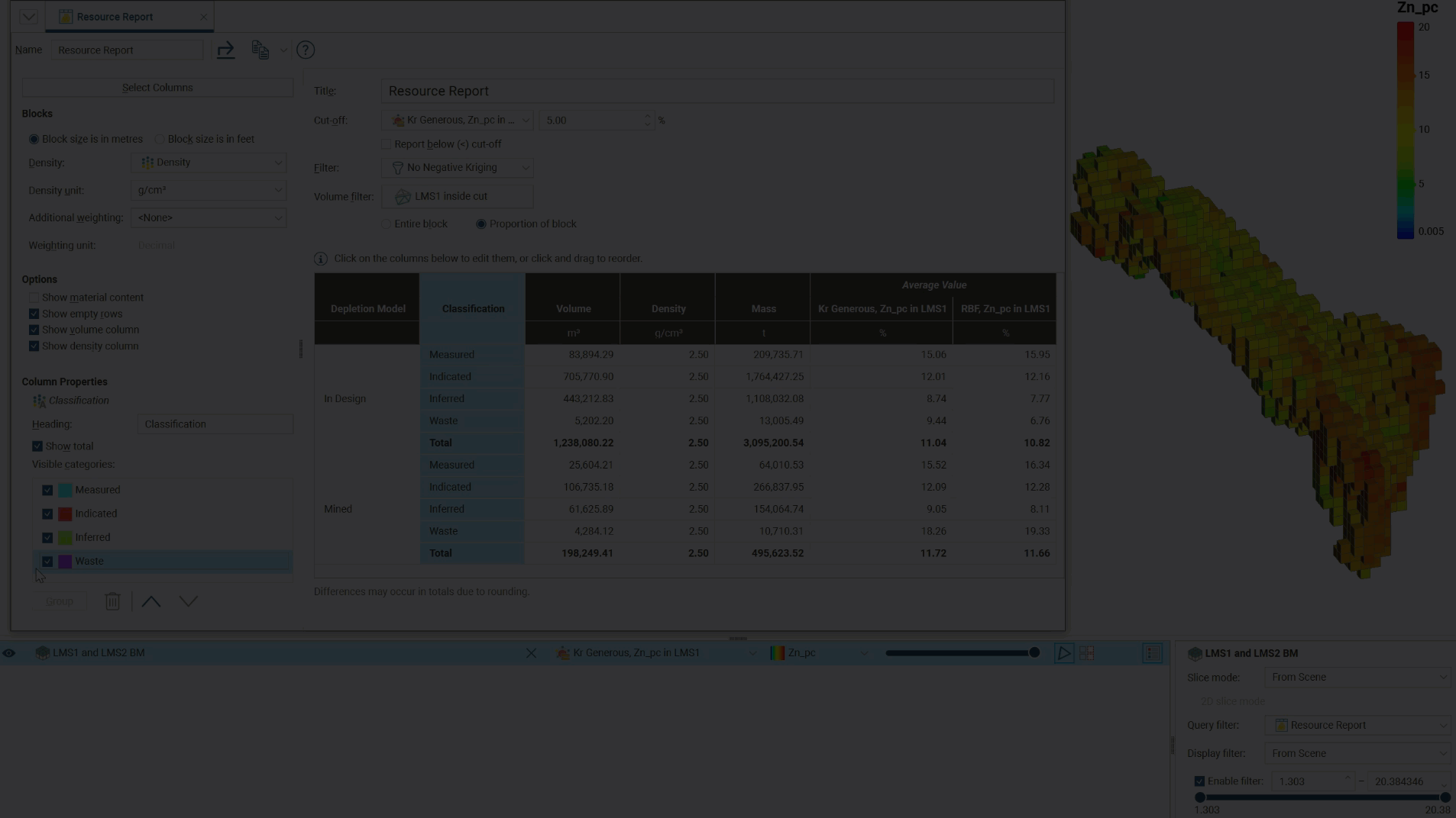 The resource report is a pivot table for reporting on resources and reserves in accordance with standards, with the freedom to customise the table to the unique needs of the project requirements. A resource report can display multiple categories and multiple numeric columns.