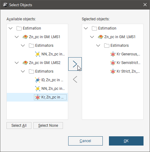 Click the Select Estimators button below the Evaluation Hierarchy. In the Select Objects window, choose from the Available objects the estimators you want to be in the combined estimator and click the right-arrow button to move them into the Selected objects list. Click OK to return to the New Combined Estimator window.