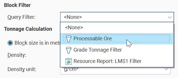 You can select a Block Filter query by choosing a filter from the Query Filter list. To add a new filter to this list, create a new filter in Calculations. See Filters and the subsequent sections in Defining Calculations and Filters for more information.