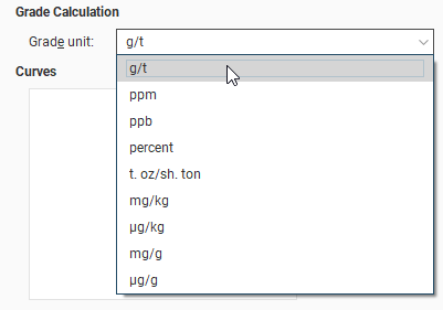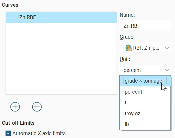 Multiple grade tonnage Curves can be added. Initially there are none listed. Click the Add button to add a new curve. Provide an identifying Name for the curve, and select the Grade calculation from the list of numeric columns in the data. If you need to write a grade calculation, you can add it as a numeric calculation in Calculations. See Numeric Calculations and the subsequent sections in Defining Calculations and Filters for more detail.
