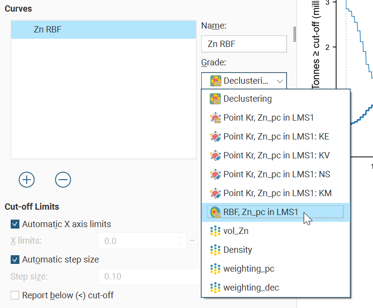 Once a curve is selected, a graph will be generated, using the automatic Cut-off Limits. You can manually override these by unticking Automatic X axis limits and specifying your preferred minimum and maximum X limits, and/or by unticking Automatic step size and specifying a preferred Step size.