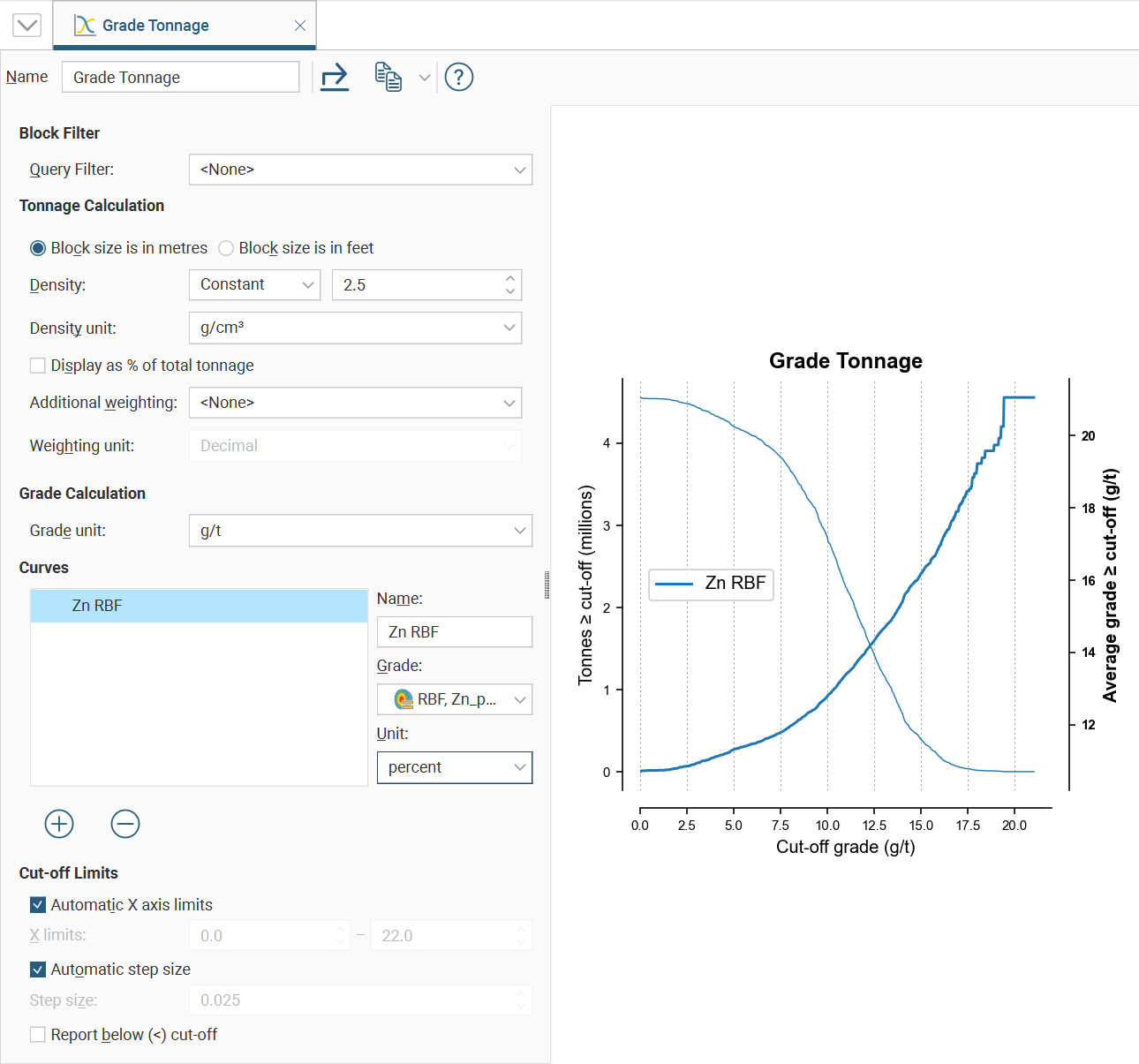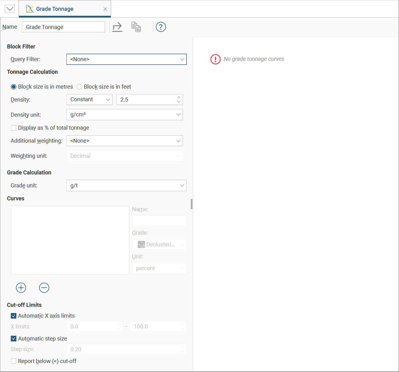 To create a grade tonnage graph, right click on a block model and select New Grade Tonnage Graph. A new Grade Tonnage window will open: