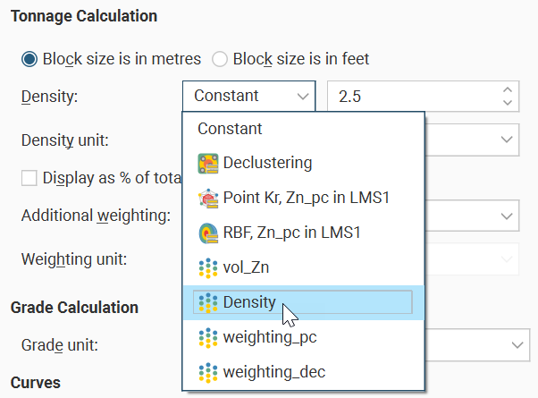 The Density can be set to a specified Constant, or one of the numerical data columns in the data can be selected, perhaps to provide a calculated density for each block.
