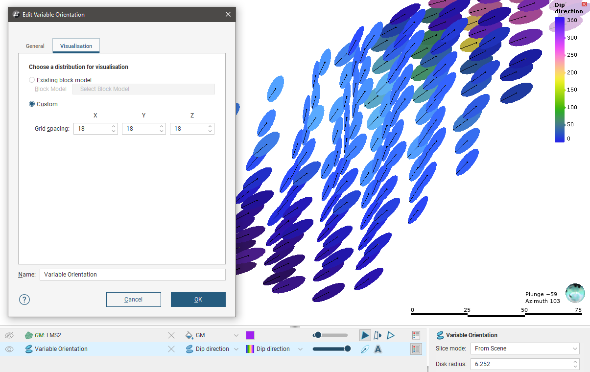 Variable orientations can be viewed as disks or lines. The grid used for visualisation can be any block model or sub-blocked model in the project or a custom grid can be specified as part of setting up the variable orientation.