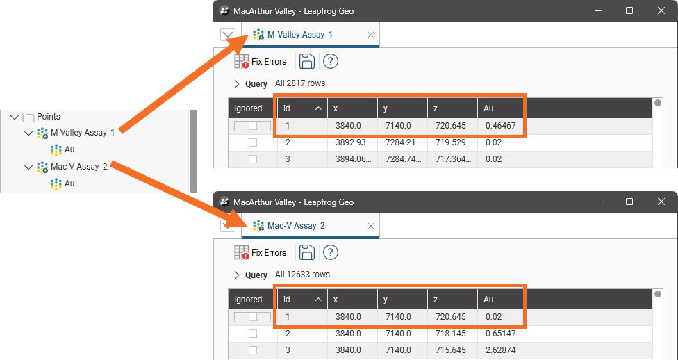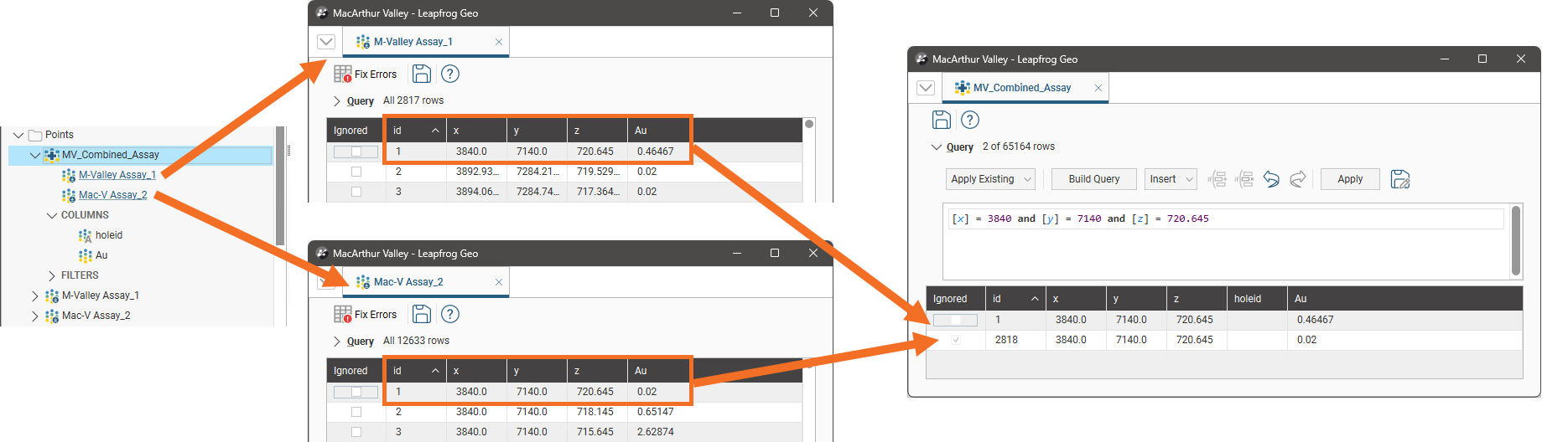 The information from each source table is used to build the combined points table, with data rows in lower priority tables marked as ignored when conflicted. For example, the two rows shown here in the combined points table MV_Combined_Assay have the same XYZ coordinates. The row with the Au value of 0.464672 is from the table M-Valley Assay_1, whereas the row with the Au value of 0.02 is from the table Mac-V Assay_2:
