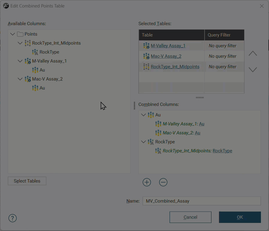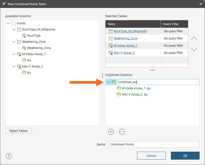 Once you have added the data columns you wish to include, set a Name for the new combined points table, then click OK. The new combined points table will be created and added to the project tree.