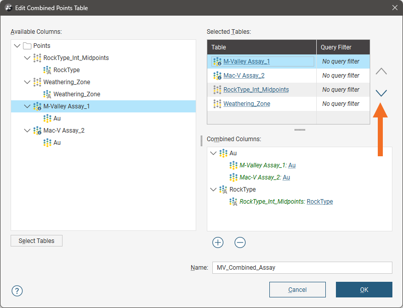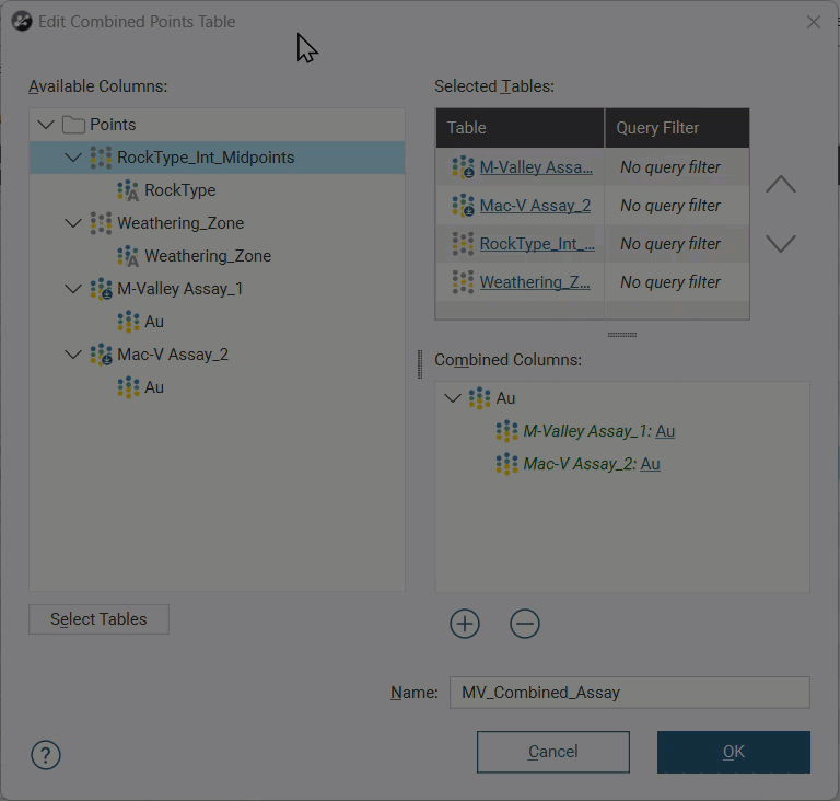 The priority of each table in the Combined Points Table window determines what information is used when there is duplicate information. For example, here the M-Valley Assay_1 table is higher in the list and so has higher priority than the Mac-V Assay_2 table: