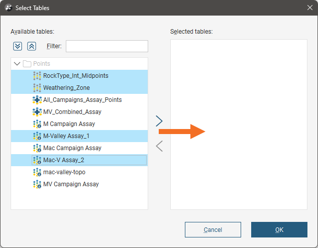 In the window that appears, all tables with suitable data columns are displayed in the Available tables list. Select those you wish to use in the combined points table and move them into the Selected tables list: