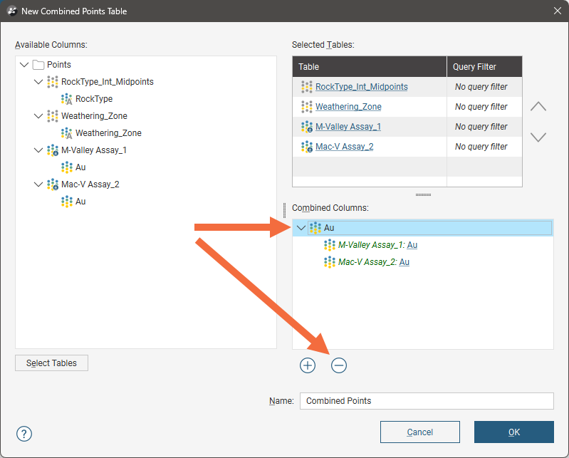 - Add more columns to the combined points table. Drag a column from the Available columns list into the Combined Columns list or click the Add button (