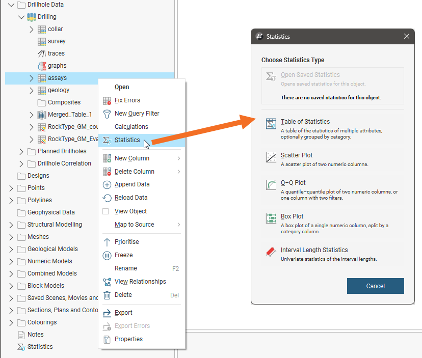 For many data tables, you can view a table of statistics for multiple attributes. To do this, right-click on a table in the project tree and select the Statistics option. A window will appear showing you what statistics tables are available for that table: