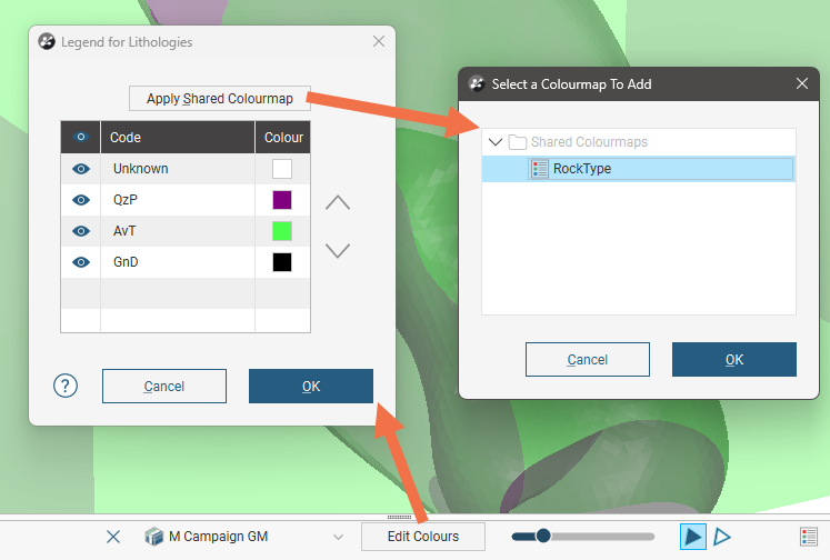 Instead of manually changing each of the category colours to match a standard colourmap, ensure the colourmap you want to use is in the Shared Colourmaps folder. Next, click Edit Colours in the shape list, and in the window that appears, click Apply Shared Colourmap. Available colourmaps will be listed; select the one you want to apply to the object categories then click OK.