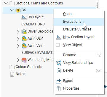In Leapfrog Geo, models can be evaluated onto other objects in the project. To do this, right-click on an object in the project tree and select Evaluations: