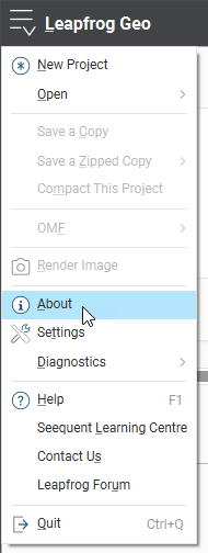 You can access your licence information by selecting About from the Leapfrog Geo menu: