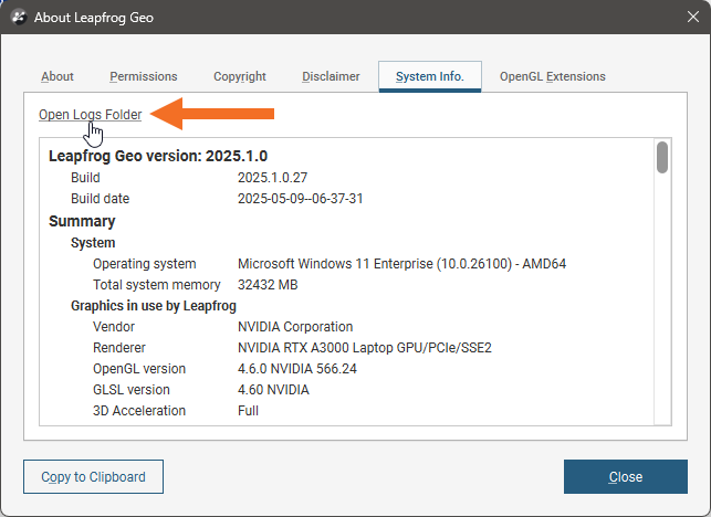 You may also be asked to provide a copy of the log files. To find out where these are stored, select About from the Leapfrog Geo menu, then click on the System Info. tab. Click on the link to open the folder that contains the log files: