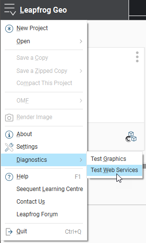 You can run a series of tests to check that your computer can connect to Seequent’s web services. To do this, either click the Test Web Services button in the Settings > Network window or click on the Leapfrog Geo menu and select Diagnostics > Test Web Services: