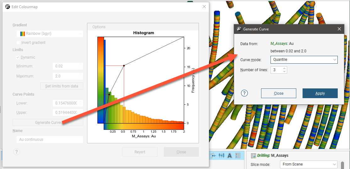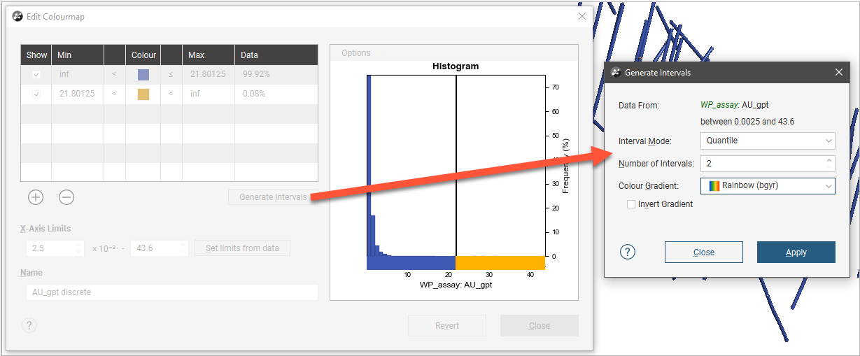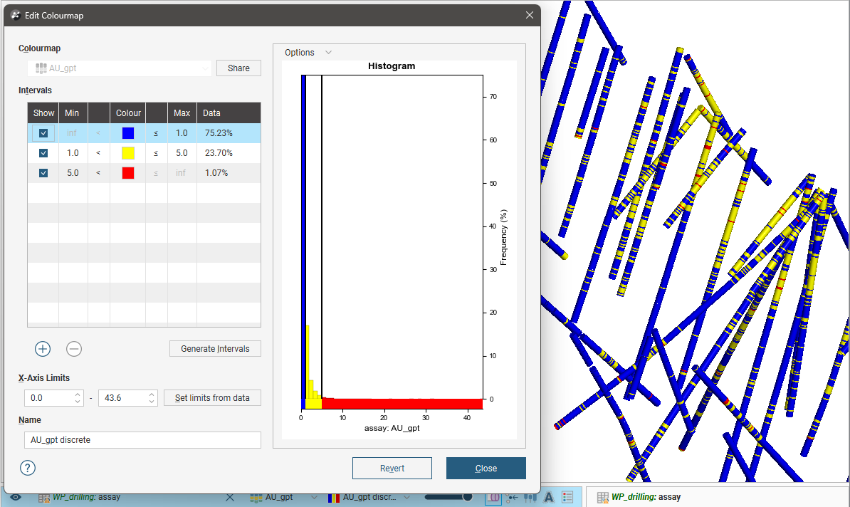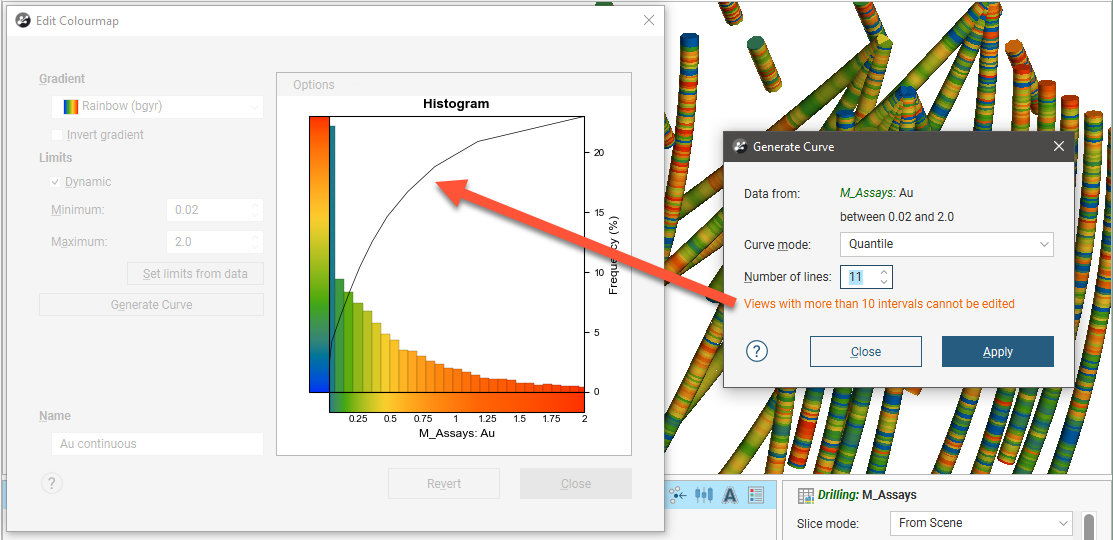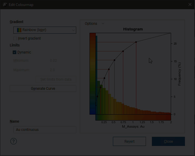 If the Dynamic option is enabled, the gradient will be updated when the data is updated, such as when drilling data is appended. If the option is disabled, the values manually set for the Minimum and Maximum limits will control the lower and upper bounds of the colourmap. Reducing the range of the upper and lower bounds is useful if the bulk of the data points have values in a range much smaller than the overall range of the data. This is common in skewed data.