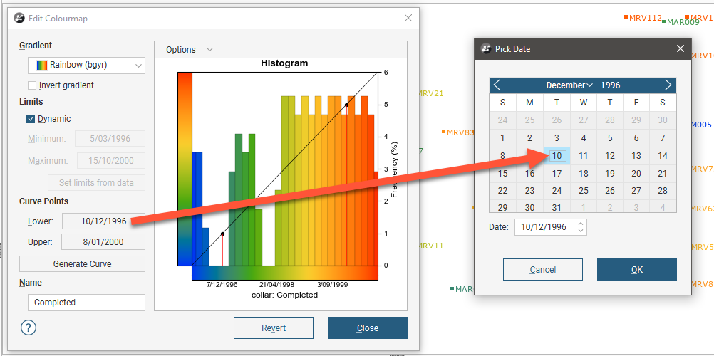 Both continuous and discrete colourmaps can be used to display date information. If a date is displayed using a continuous colourmap, the curve points represent the start and end dates: