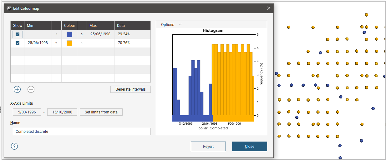 You can also add intervals manually by clicking the Add button. For example, if you create a discrete colourmap to show the different stages of a drilling campaign, the initial colourmap contains only two intervals: