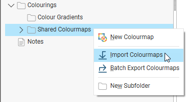 To import one or more colourmaps into the Colourings > Shared Colourmaps folder, right-click on the Shared Colourmaps folder in the project tree and select Import Colourmaps.