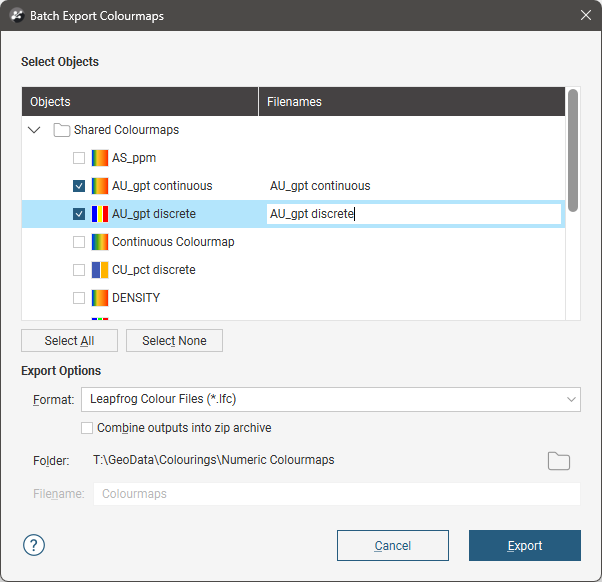To export more than one shared colourmap, right-click on the Shared Colourmaps folder in the project tree and select Batch Export Colourmaps. In the window that appears, select the colourmaps you wish to export and change their names, if required: