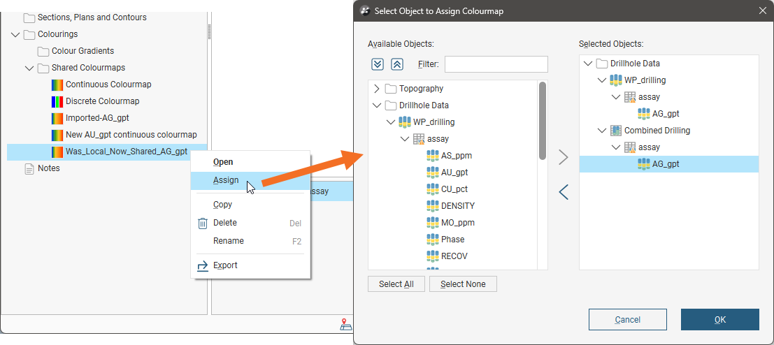 - A shared colourmap can be used by multiple objects in a project. Shared colourmaps are stored in the Colourings > Shared Colourmaps folder. You can see what objects are using any given colourmap by right-clicking on it in the project tree and selecting Assign. This opens a window that lists wherever the colourmap is used and also allows you to share it to other suitable objects in the project.