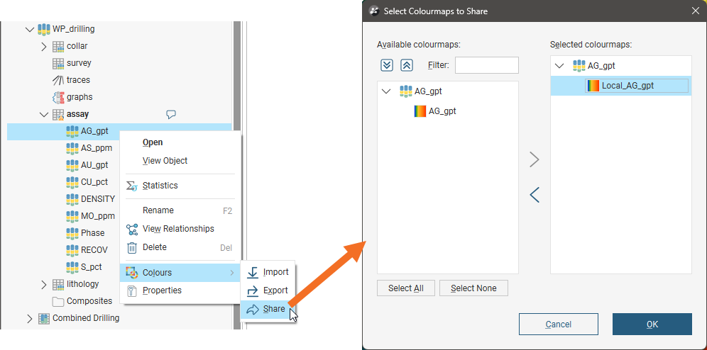 To share a local colourmap, right-click on its parent object in the project tree and select Colours > Share. In the window that appears, select which colourmaps you wish to share, then click OK.