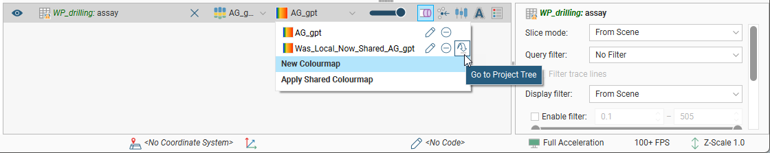 - A local colourmap applies only to a single object, such as a numeric data column in a drilling data table. Local colourmaps are not visible in the project tree.