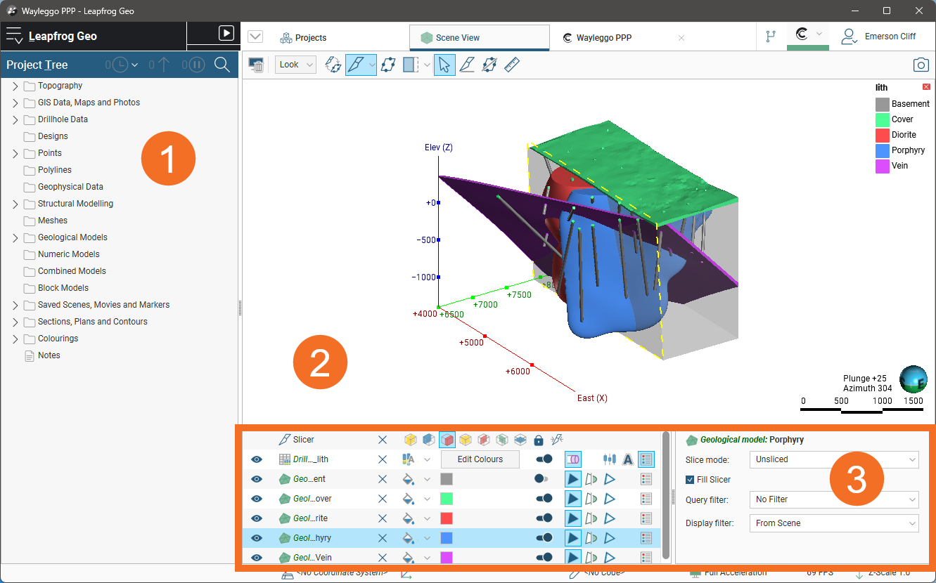 This topic provides an overview of the different parts of the Leapfrog Geo window, which is divided into three main parts: