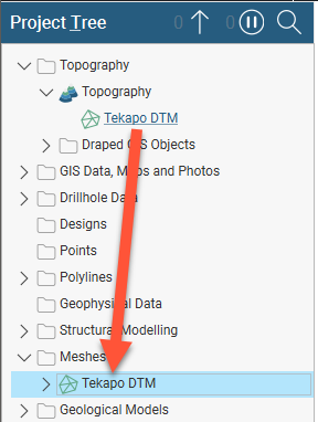 The way folders and objects are organised in the project tree lets you reveal or hide information about an object to focus on objects you are currently working with. This is also useful when you are exploring a project and want to determine how something was put together. The arrows next to objects in the project tree let you reveal or hide an object’s details to focus on objects you are currently working with. Here, the Topographies folder is expanded to show a Topography object that is made up of a mesh: