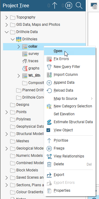 You can right-click on data objects within the top-level folders to view more information on that object or carry out actions specific to that object. For example, right-clicking on a table of imported drilling data reveals a menu showing possible actions: