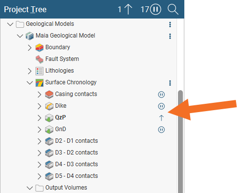 - The Output Volumes folder contains the generated units (outputs) that make up the geological model.