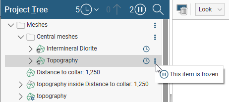 Some objects in a project may be marked with different status indicators. For example, here three surfaces are marked as frozen (